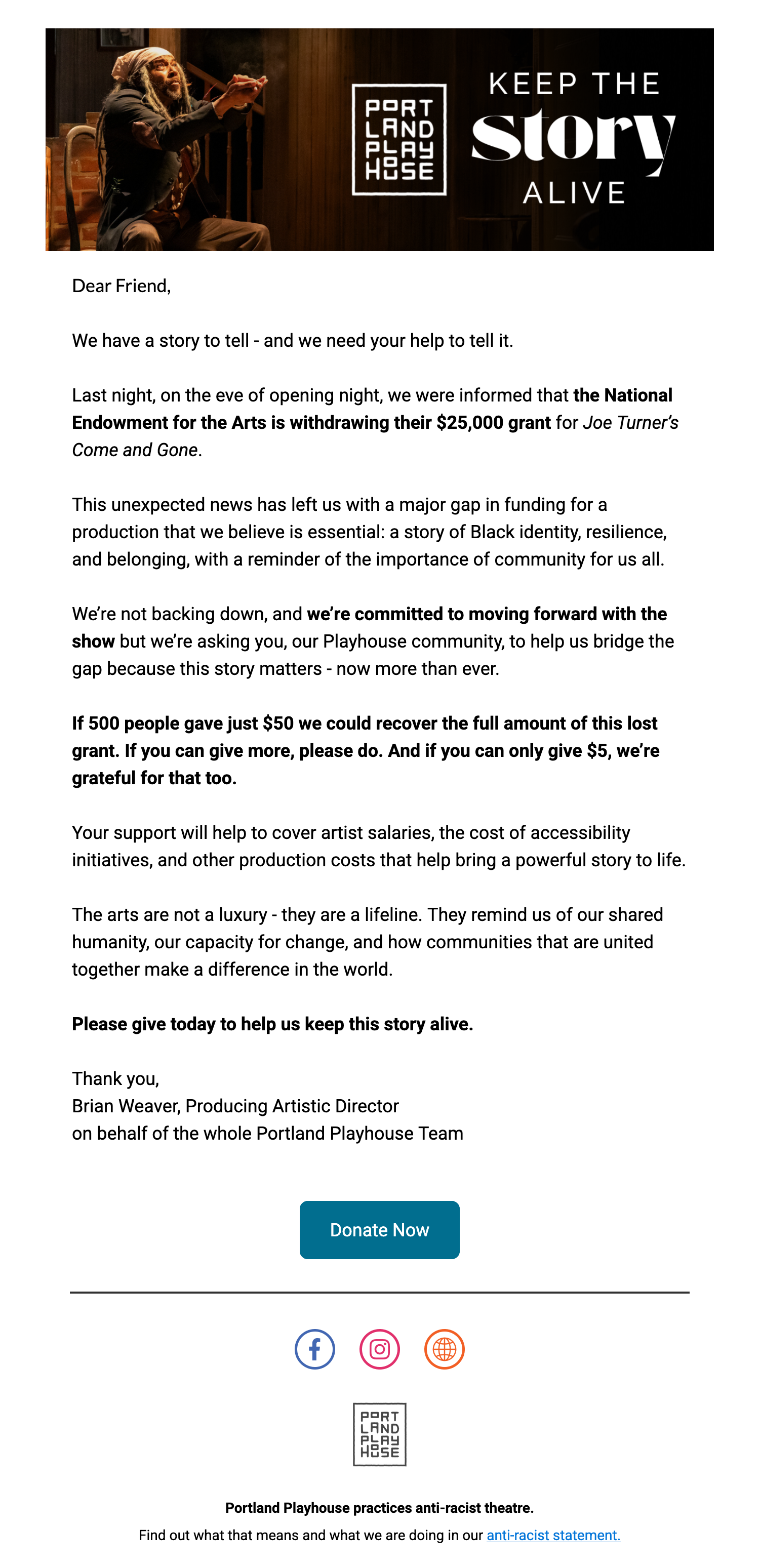On the eve of opening night for August Wilson’s Joe Turner’s Come and Gone, Portland Playhouse’s $25,000 NEA grant was unexpectedly withdrawn. Working alongside the Executive Director and Communications Director, I helped launch the 'Keep the Story Alive' campaign—a rapid-response initiative that provided our community with a constructive outlet for their collective frustration. By aligning our fundraising with the cultural moment, we successfully filled the funding gap and reinforced the Playhouse’s role as a vital space for storytelling.