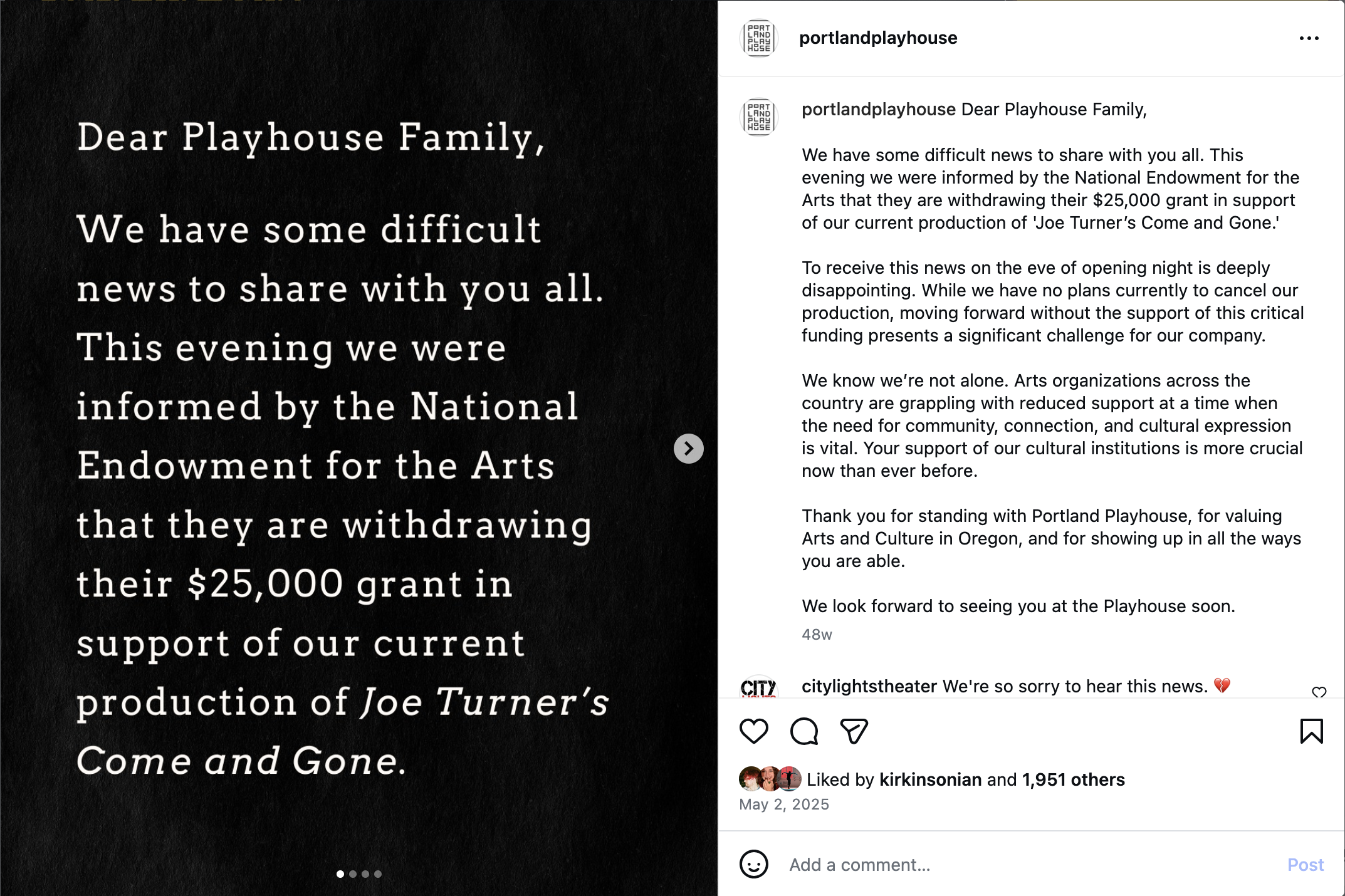Press Links: “Portland Playhouse Loses $25,000 National Endowment for the Arts Award,” Willamette Week | “NEA Abruptly Pulls Arts Grants on a Massive Scale,” American Theatre | “‘Radical de-investment': $600K cut to Oregon arts groups,” KOIN 6